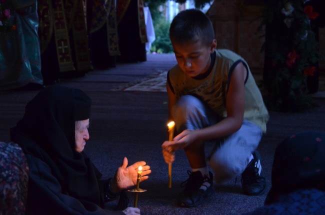 Miercuri seară, după scoaterea din biserica mănăstirii a sfintelor moaşte şi aşezarea lor într-un baldachin special amenajat în curtea lăcaşului de cult, slujba Privegherii a continuat cu Prohodul Maicii Domnului. Cu lumânări aprinse în mâini, credincioşi de toate vârstele au cântat Maicii Vieţii, cea „de a cărei mutare şi îngerii s-au mirat“.