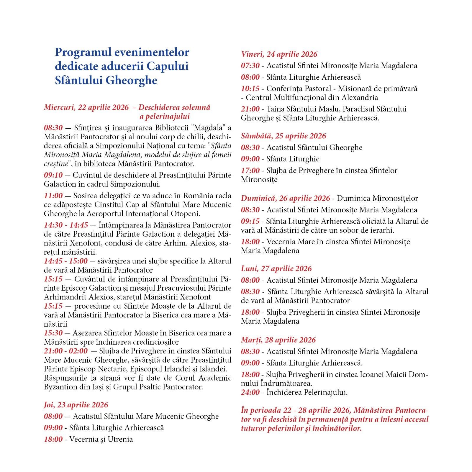 „Aducerea Cinstitului Cap al Sfântului Mare Mucenic Gheorghe în România, la Mănăstirea Pantocrator, este un eveniment unic, deoarece moaștele Sfântului vor putea fi cinstite de credincioșii din țara noastră chiar în ziua de prăznuire a Sfântului. Acest moment al aducerii Cinstitului Cap al Sfântului Gheorghe va fi marcat la Mănăstirea Pantocrator prin mai multe manifestări liturgice și culturale. Printre acestea se numără o priveghere după tipicul athonit, în seara zilei de 22 aprilie, cu participarea arhimandritului Alexios, starețul Mănăstirii Xenofont. Privegherea va culmina cu Sfânta Liturghie arhierească din dimineața zilei de 23 aprilie. Răspunsurile liturgice vor fi date de părinții Mănăstirii Xenofont, Corul Academic Byzantion și Grupul Psaltic Pantocrator.