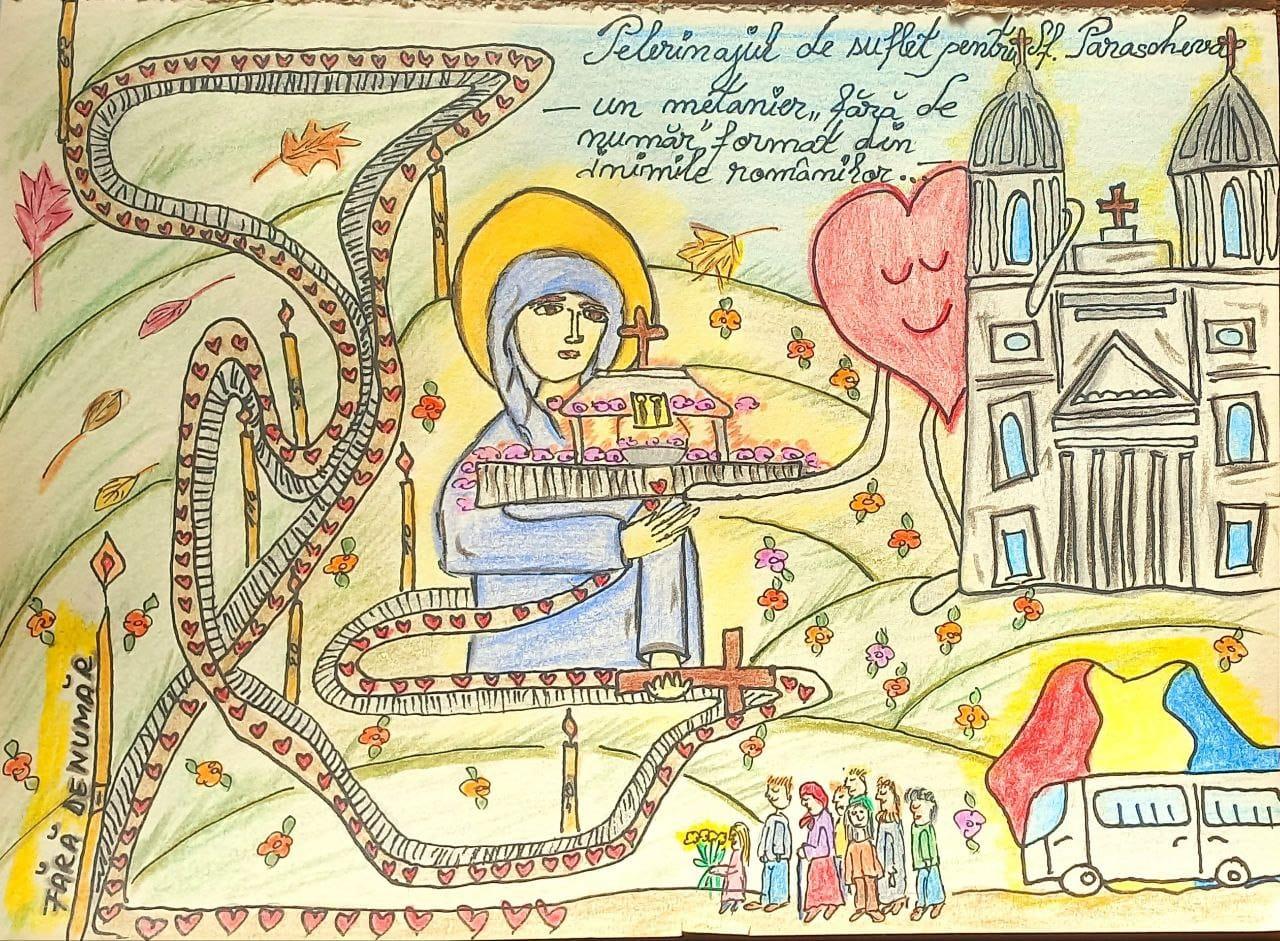 Emoționată de trăirea acestui moment, voluntara a realizat o pictură în care sunt reprezentate Sfânta Parascheva, Catedrala Mitropolitană și mulțimea de credincioși, desenați sub forma unor inimi ce formează un uriaș metanier – un lanț al rugăciunii și al dragostei creștine.