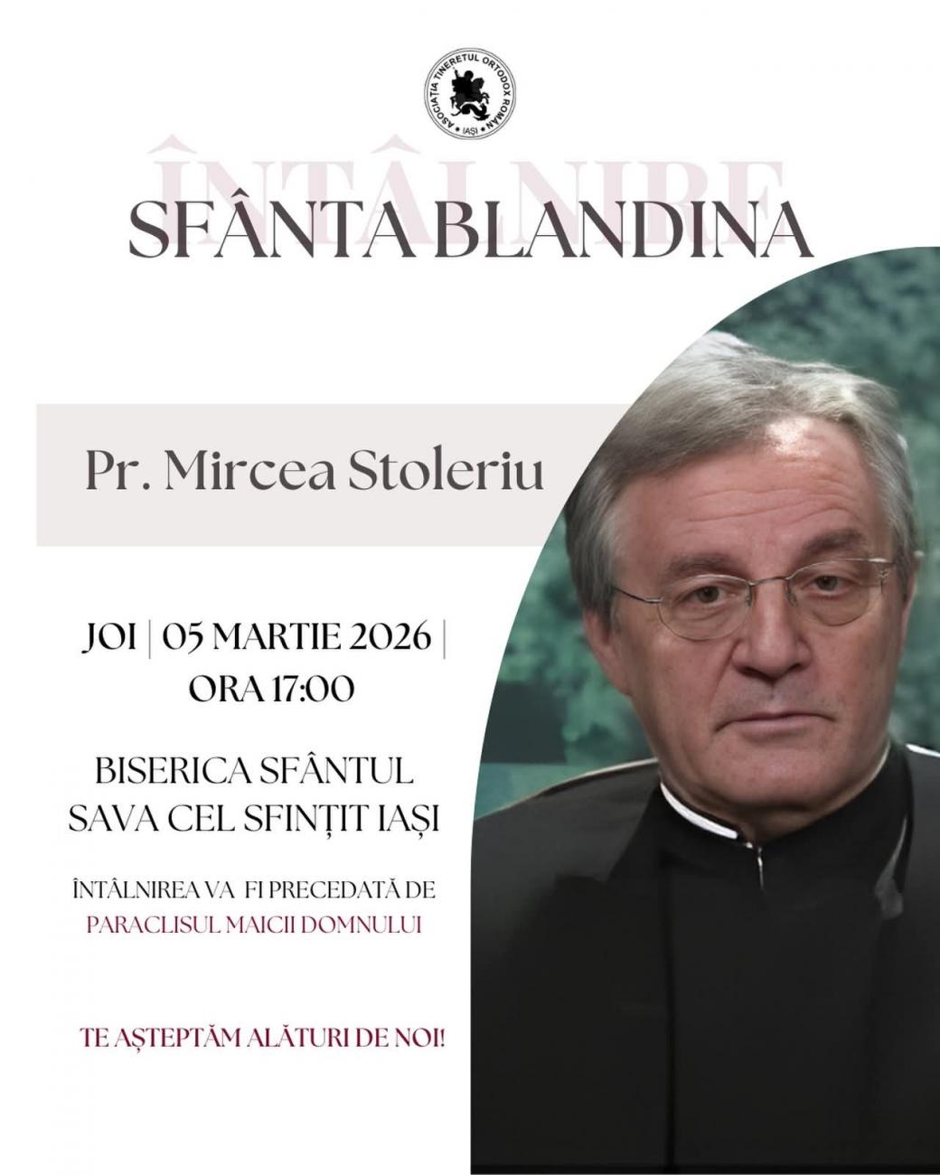 La Biserica „Sfântul Sava cel Sfințit” din Iași, începând cu ora 17.00, se va desfășura o întâlnire duhovnicească, în cadrul căreia părintele Mircea Stoleriu va susține conferința intitulată: „Sfânta Blandina”. Întâlnirea va fi precedată de Paraclisul Maici Domnului.