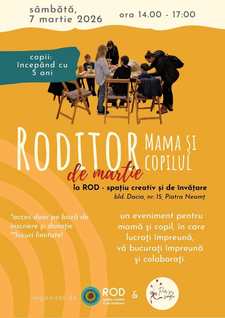 În intervalul 14.00-17.00, la ROD – spațiu creativ și de învățare, în colaborare cu Atelierul de artă „Pur și simplu”, va avea loc evenimentul „Roditor de martie – Mama și copilul”, dedicat mamelor și copiilor. Evenimentul se adresează copiilor începând cu vârsta de 5 ani și propune o experiență comună, în care mama și copilul lucrează împreună, se bucură de timp de calitate și creează împreună. Accesul se face doar pe bază de înscriere și donație, iar locurile sunt limitate.