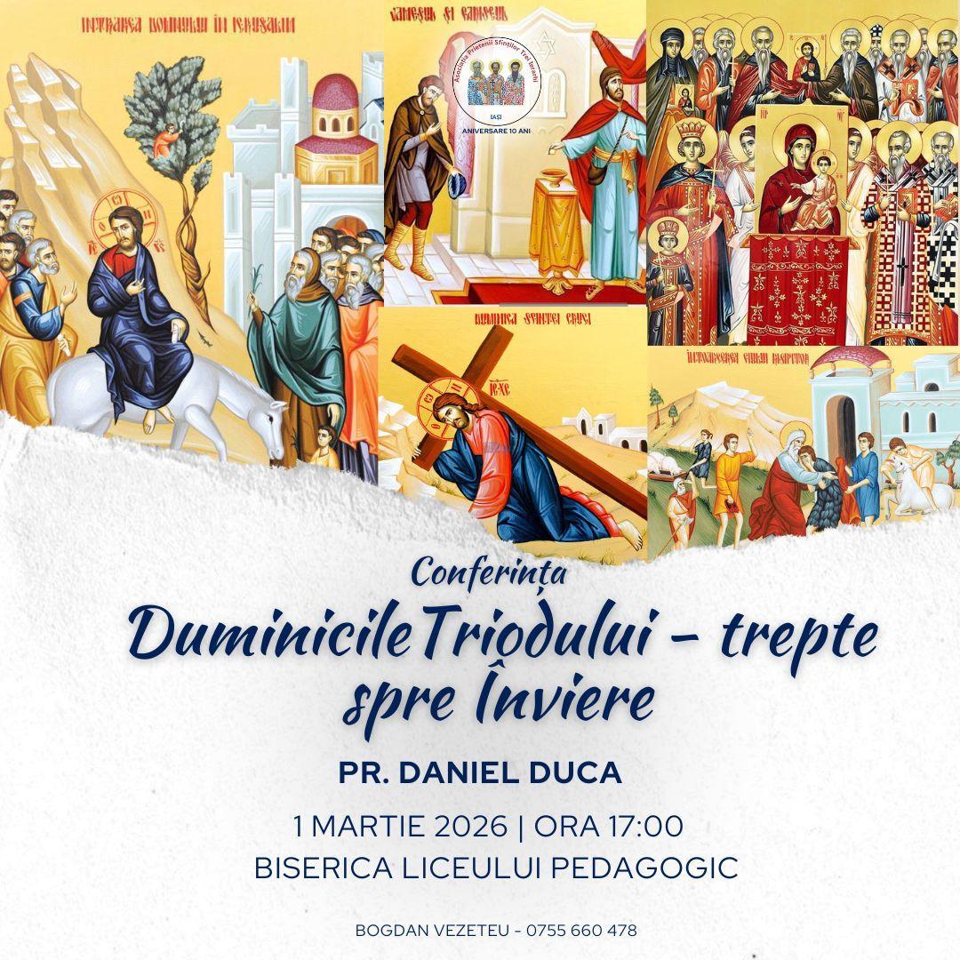 Asociația „Prietenii Sfinților Trei Ierarhi” Iași organizează, în intervalul orar 17.00-19.00, conferința intitulată „Duminicile Triodului – trepte spre Înviere”, care se va desfășura la Biserica „Sfinții Trei Ierarhi” de la Colegiul Pedagogic Iași. Invitatul conferinței este părintele dr. Daniel Duca, iar publicul țintă este format din membri ai Asociației, precum și din elevi și studenți ai diferitelor licee și facultăți ieșene. Seara duhovnicească va fi precedată de Paraclisul Maicii Domnului, care va avea loc de la ora 16.00.
