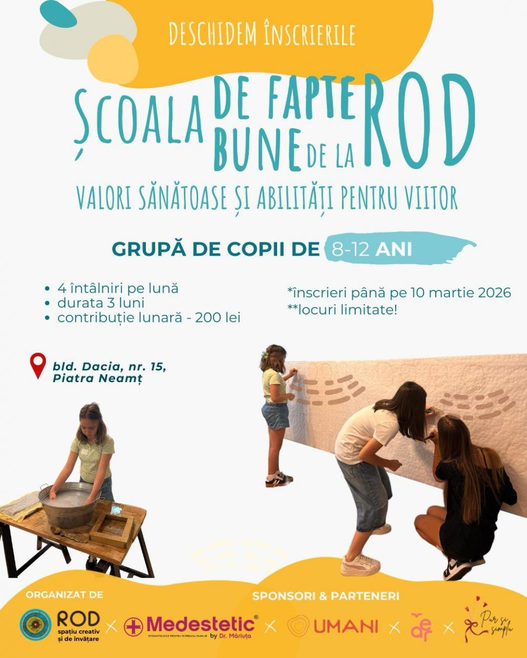 ROD – spațiu creativ și de învățare, situat pe bulevardul Dacia, nr. 15, Piatra Neamț, dă startul celei de-a VIII-a ediții a Școlii de Fapte Bune, un program dedicat copiilor cu vârste între 8 și 12 ani, în care aceștia învață să facă bine prin activități și experiențe practice. Participarea presupune o contribuție lunară de 200 de lei. Înscrierile sunt deschise până la data de 10 martie 2026, iar numărul de locuri este limitat.