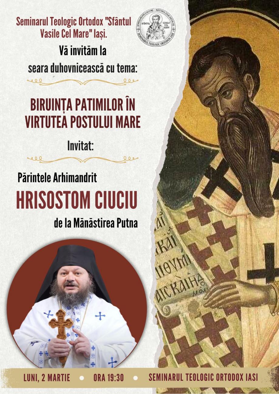 Seminarul Teologic Ortodox „Sfântul Vasile cel Mare” din Iași organizează, de la ora 19.30, o seară duhovnicească cu tema: „Biruința patimilor în virtutea Postului Mare”. Invitatul evenimentului este părintele arhimandrit Hrisostom Ciuciu de la Mănăstirea Putna.