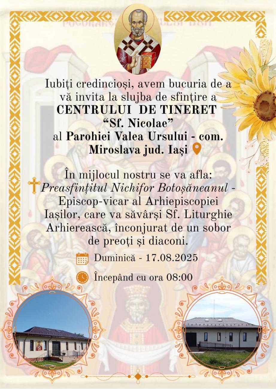Preasfinţitul Părinte Nichifor Botoşăneanul, Episcop-vicar al Arhiepiscopiei Iaşilor, înconjurat de un sobor de preoți și diaconi, va oficia slujba Sfintei Liturghii la Parohia Valea Ursului din comuna Miroslava, Iași, prilej cu care va fi sfințit Centrul de tineret „Sfântul Nicolae” al parohiei.