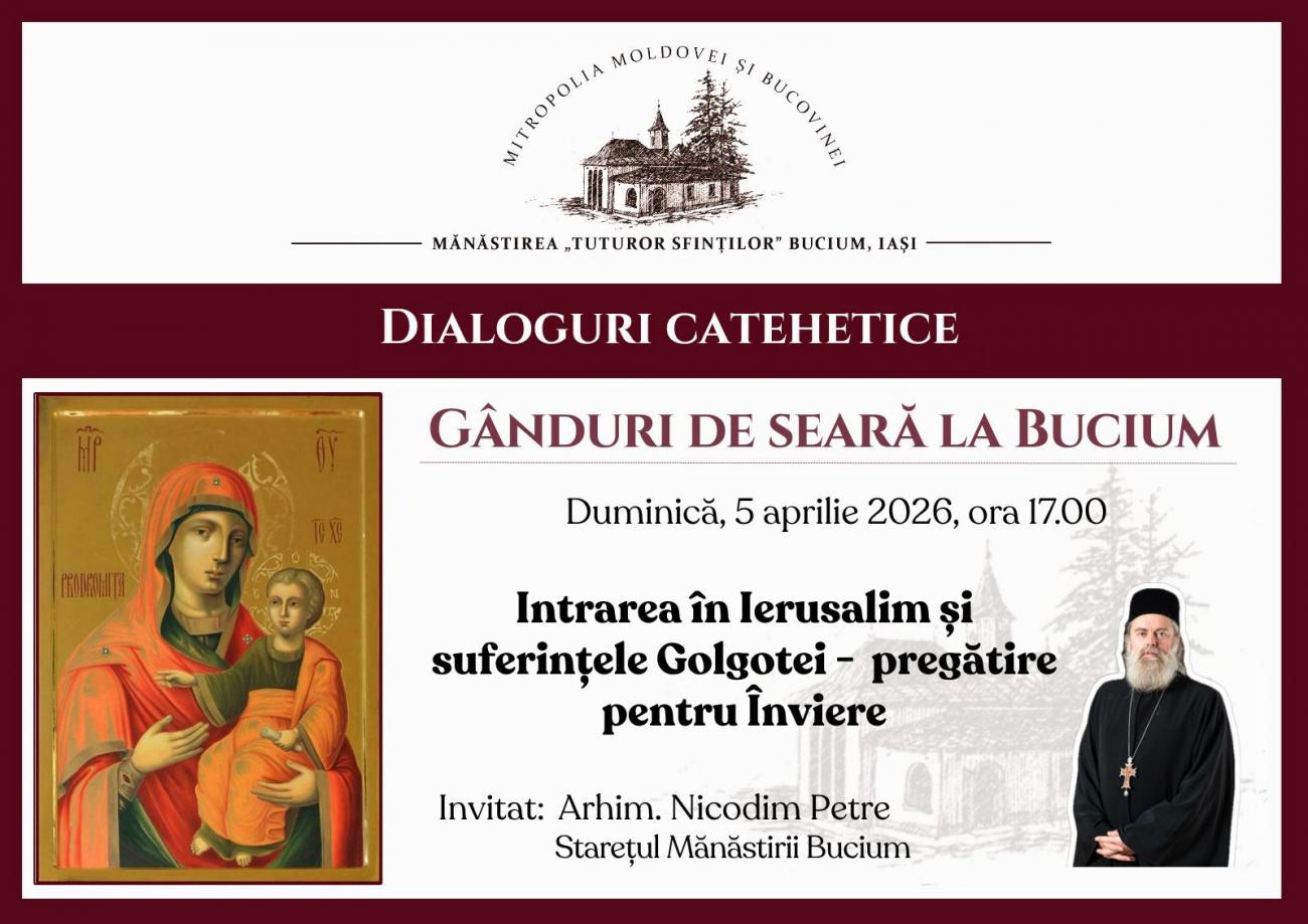 La Mănăstirea „Tuturor Sfinților” Bucium din Iași, în cadrul serilor catehetice „Gânduri de seară la Bucium”, va avea loc, începând cu ora 17.00, un nou dialog catehetic, sub genericul „Intrarea în Ierusalim și suferințele Golgotei – pregătire pentru Înviere”. Moderatorul întâlnirii, Bogdan Neculau, îl va avea ca invitat pe părintele arhimandrit Nicodim Petre, Consilierul Sectorului de Misiune, al Arhiepiscopiei Iașilor și Starețul Mănăstirii Bucium din Iași.