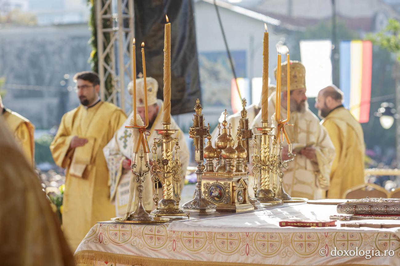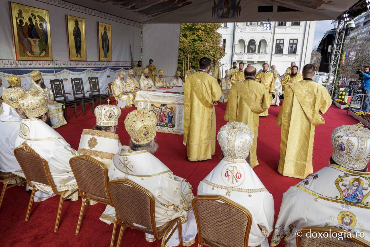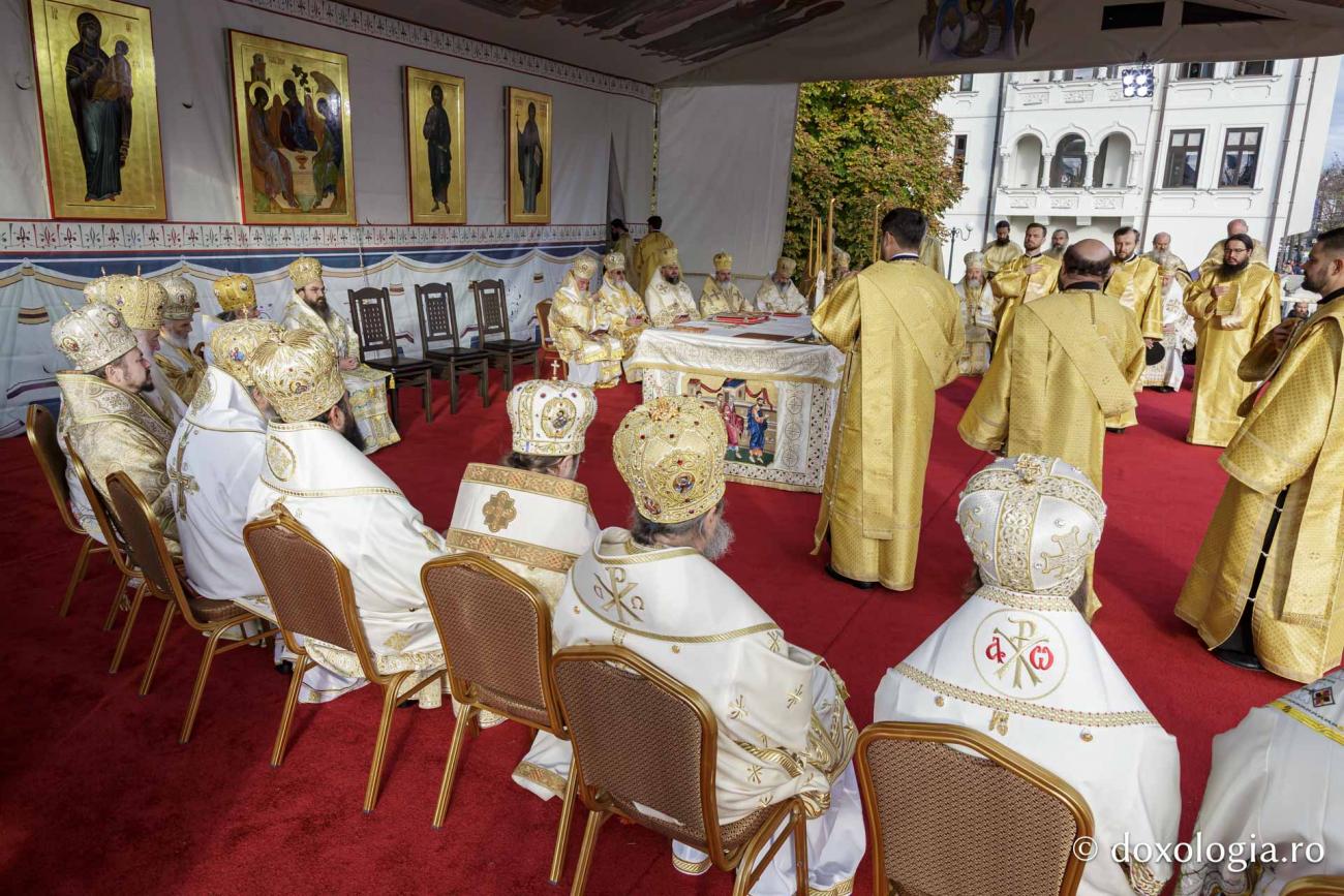 La Sfânta Liturghie prilejuită de hramul Sfintei Cuvioase Parascheva de la Iași slujește un sobor de ierarhi, preoți și diaconi, în frunte cu Înaltpreasfințitul Părinte Teofan, Arhiepiscopul Iașilor și Mitropolitul Moldovei și Bucovinei.