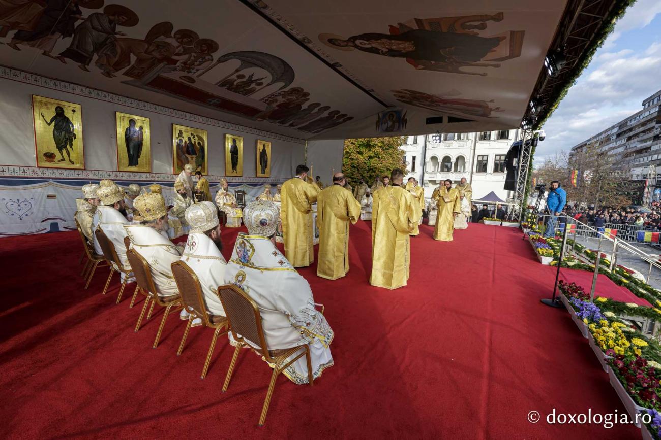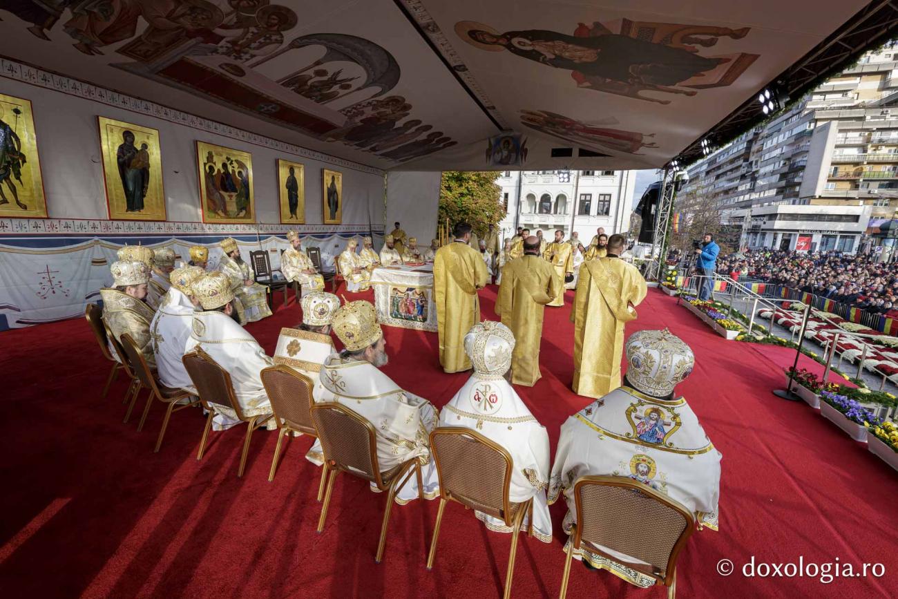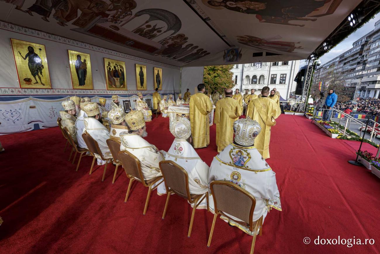 La Sfânta Liturghie prilejuită de hramul Sfintei Cuvioase Parascheva de la Iași slujește un sobor de ierarhi, preoți și diaconi, în frunte cu Înaltpreasfințitul Părinte Teofan, Arhiepiscopul Iașilor și Mitropolitul Moldovei și Bucovinei.