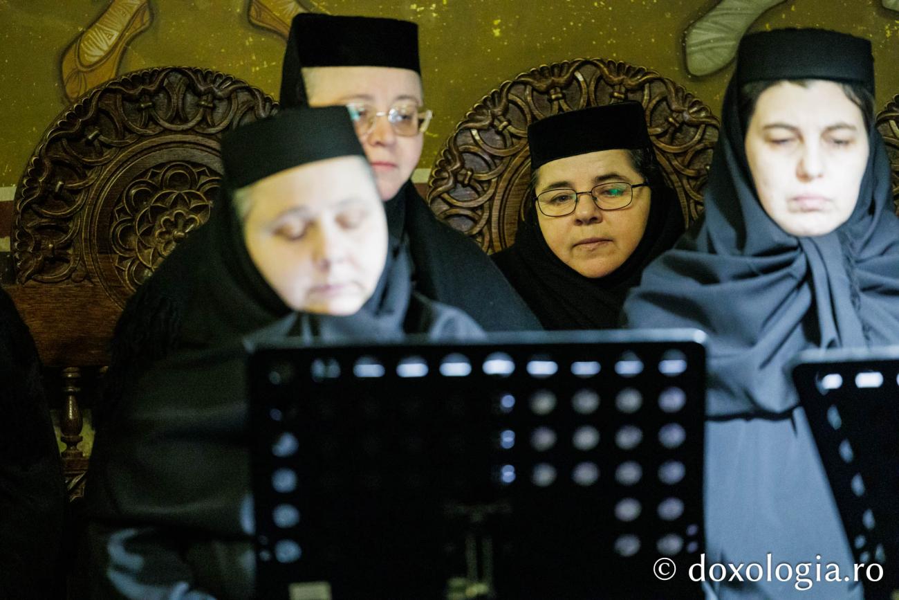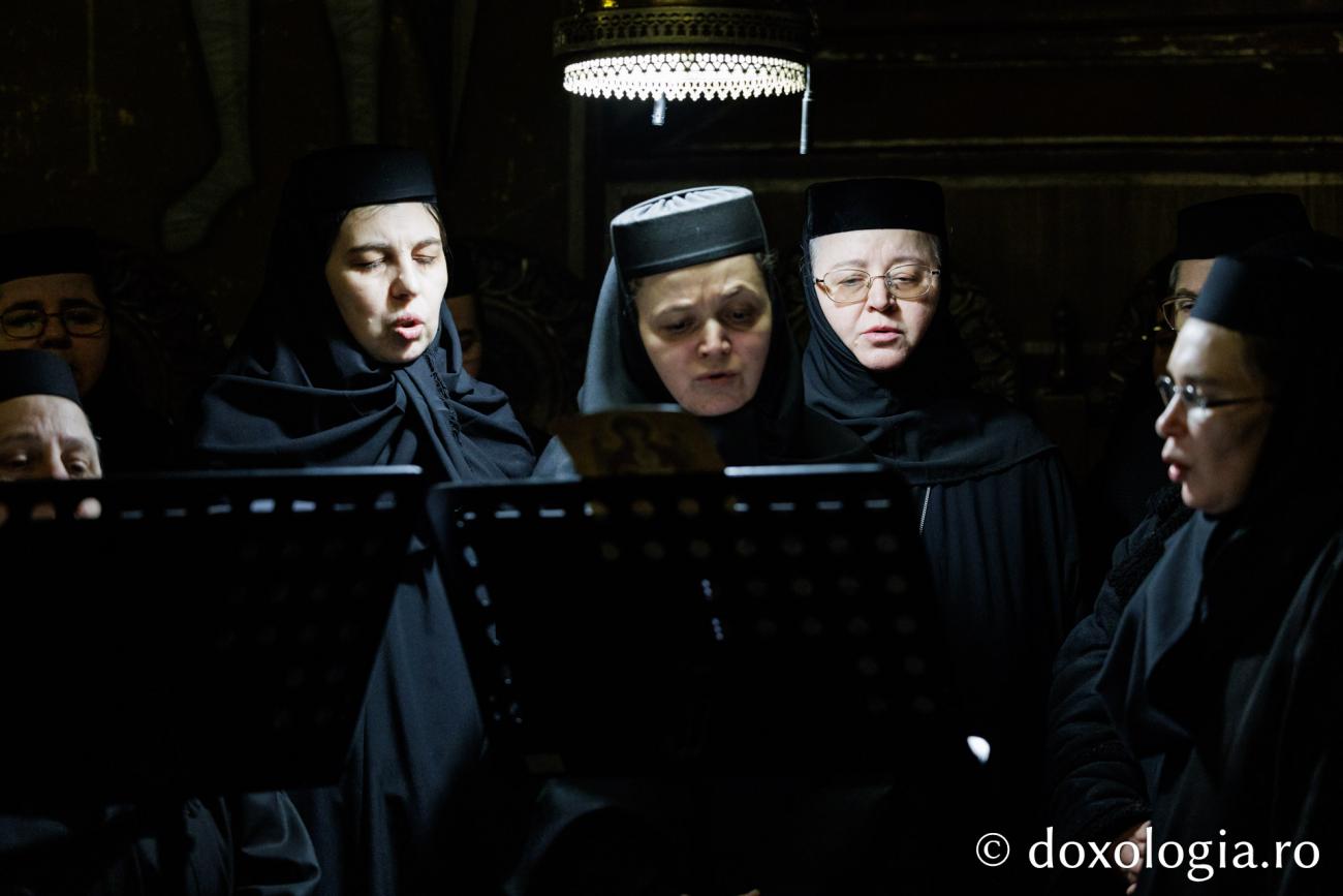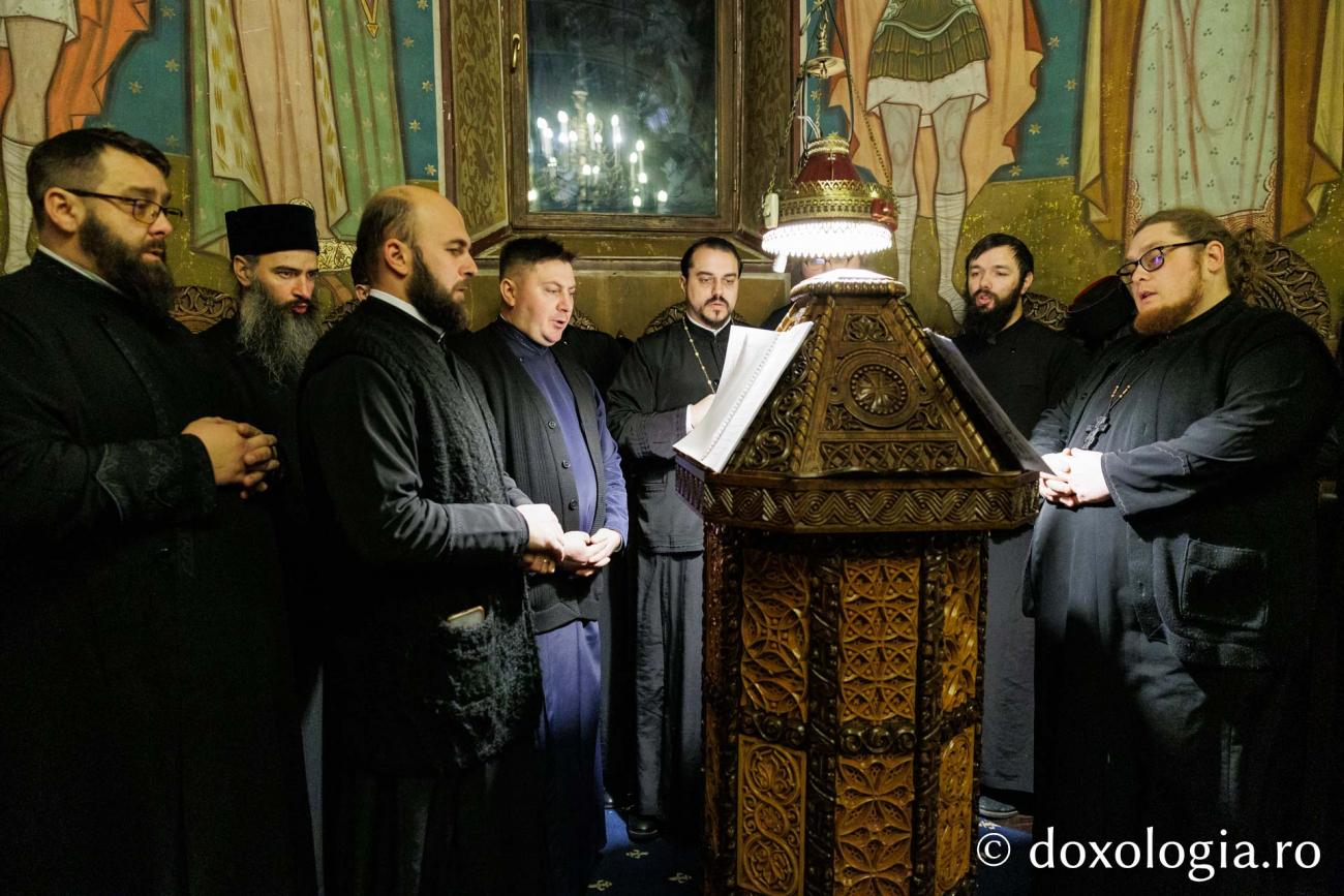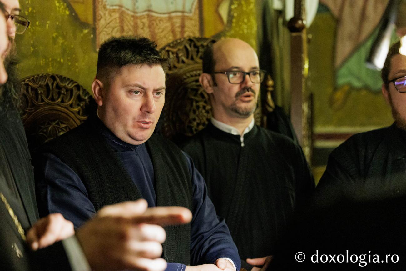 La slujba privegherii a slujit un sobor de preoți și diaconi sub protia părintelui arhimandrit Elisei Nedescu, starețul Mănăstirii „Sfinții Trei Ierarhi” din Iași, iar răspunsurile liturgice au fost date de Corul preoțesc „Apostolii” (în strana dreaptă) și, respectiv, de corul mănăstirii Copou (în strana stângă)