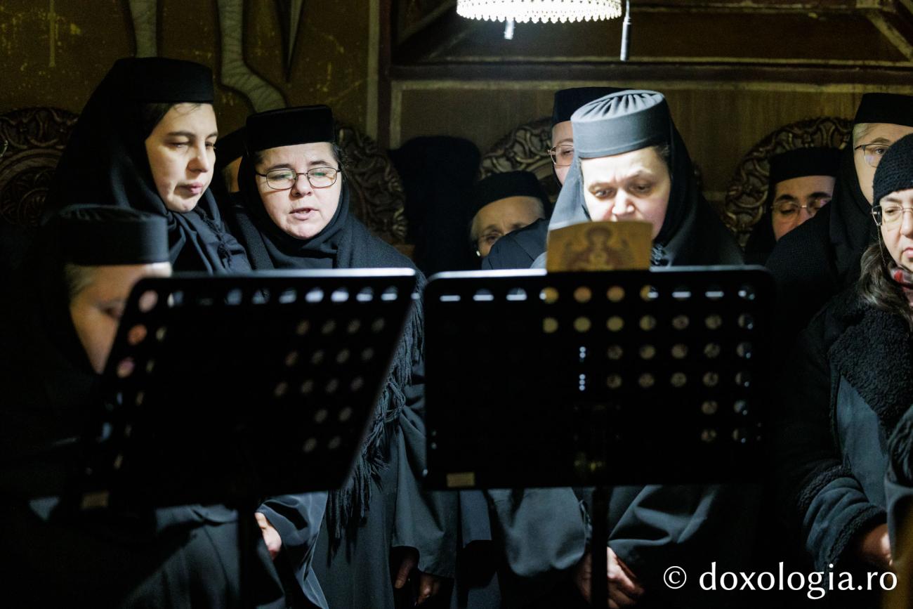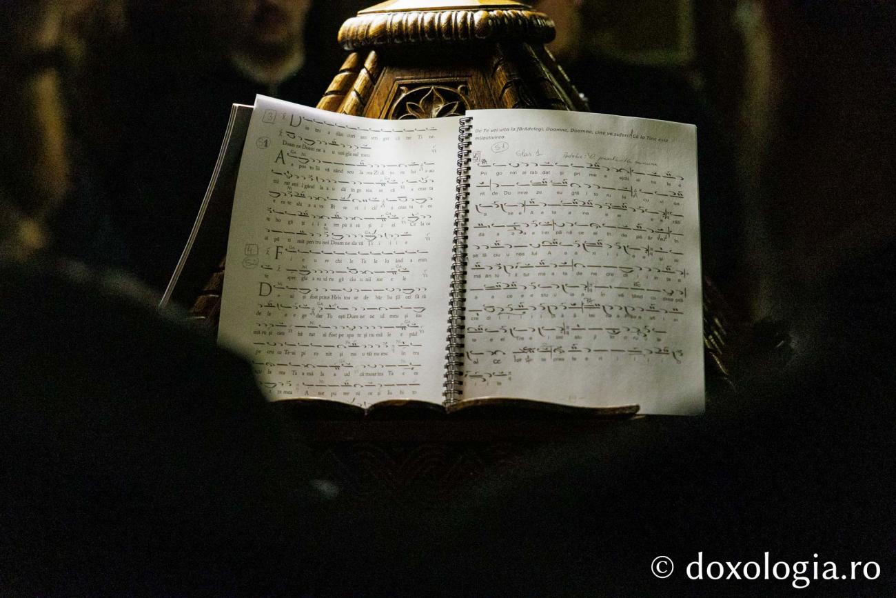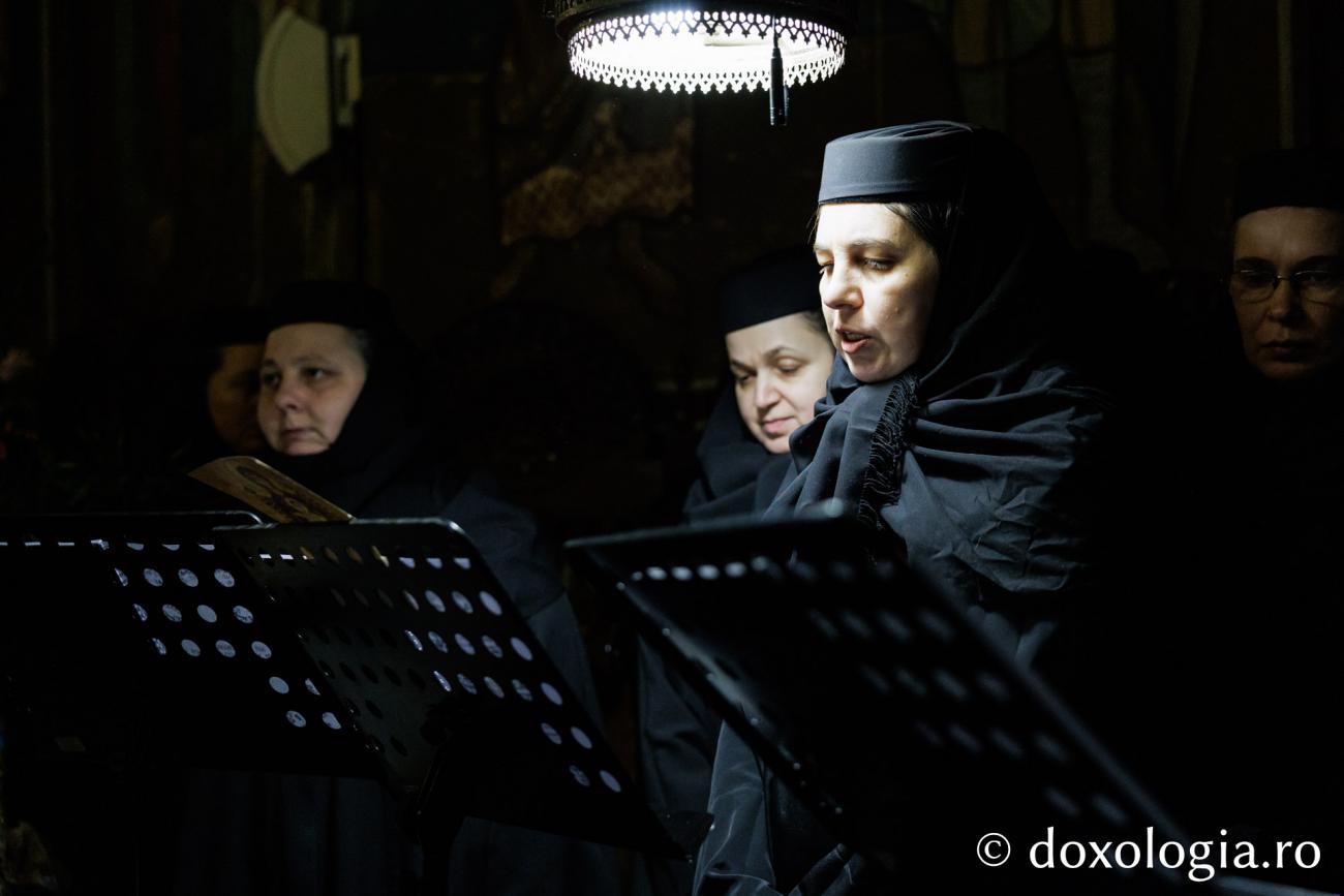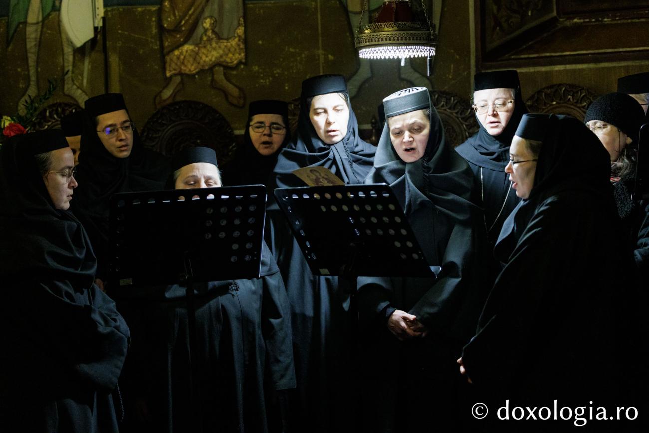 La slujba privegherii a slujit un sobor de preoți și diaconi sub protia părintelui arhimandrit Elisei Nedescu, starețul Mănăstirii „Sfinții Trei Ierarhi” din Iași, iar răspunsurile liturgice au fost date de Corul preoțesc „Apostolii” (în strana dreaptă) și, respectiv, de corul mănăstirii Copou (în strana stângă)