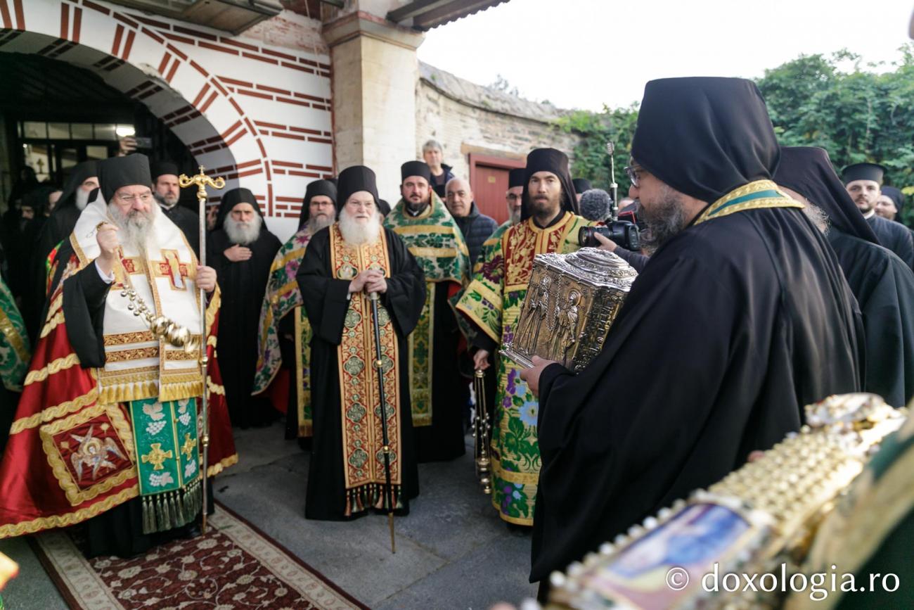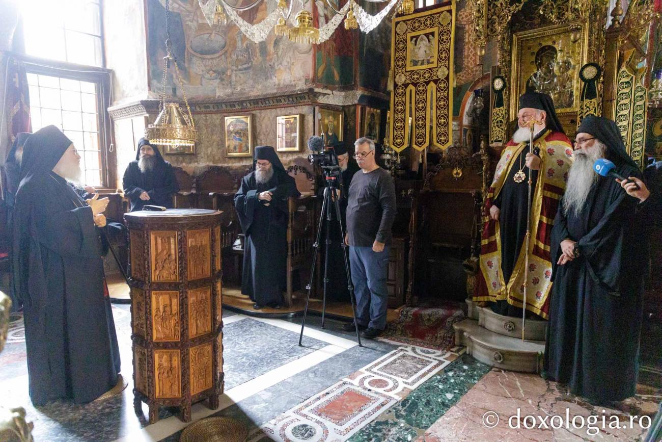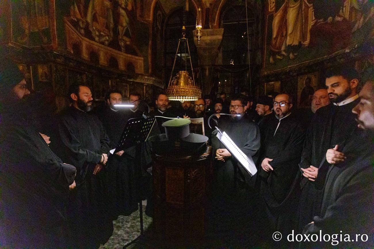 Răspunsurile la strană stângă au fost date de Corul „Tronos” al Patriarhiei Române, condus de Arhidiaconul Mihail Bucă, iar în strana dreapta a cântat părintele Damaschin de la Nea Skiti dimpreună cu ucenicii.