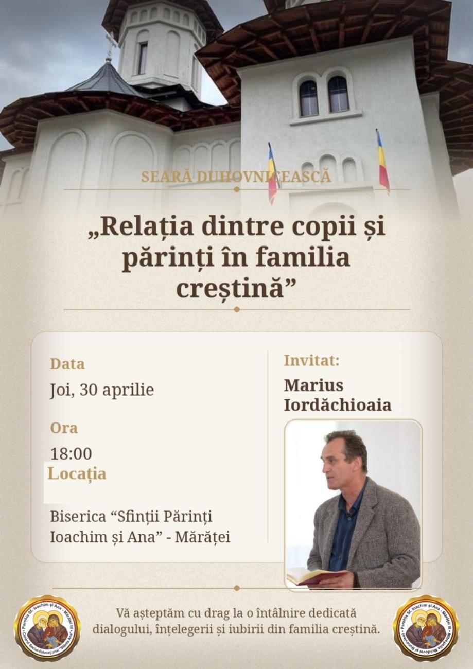 Parohia Sfinții Părinți Ioachim și Ana” – Mărăței III, Piatra Neamț, în colaborare cu ATOR – Piatra Neamț, organizează, începând cu ora 18.00, o seară duhovnicească, în cadrul căreia poetul creștin Marius Iordăchioaia va susține o conferință cu tema „Relația dintre copii și părinți în familia creștină”.