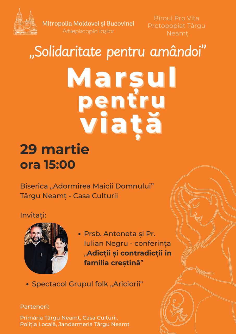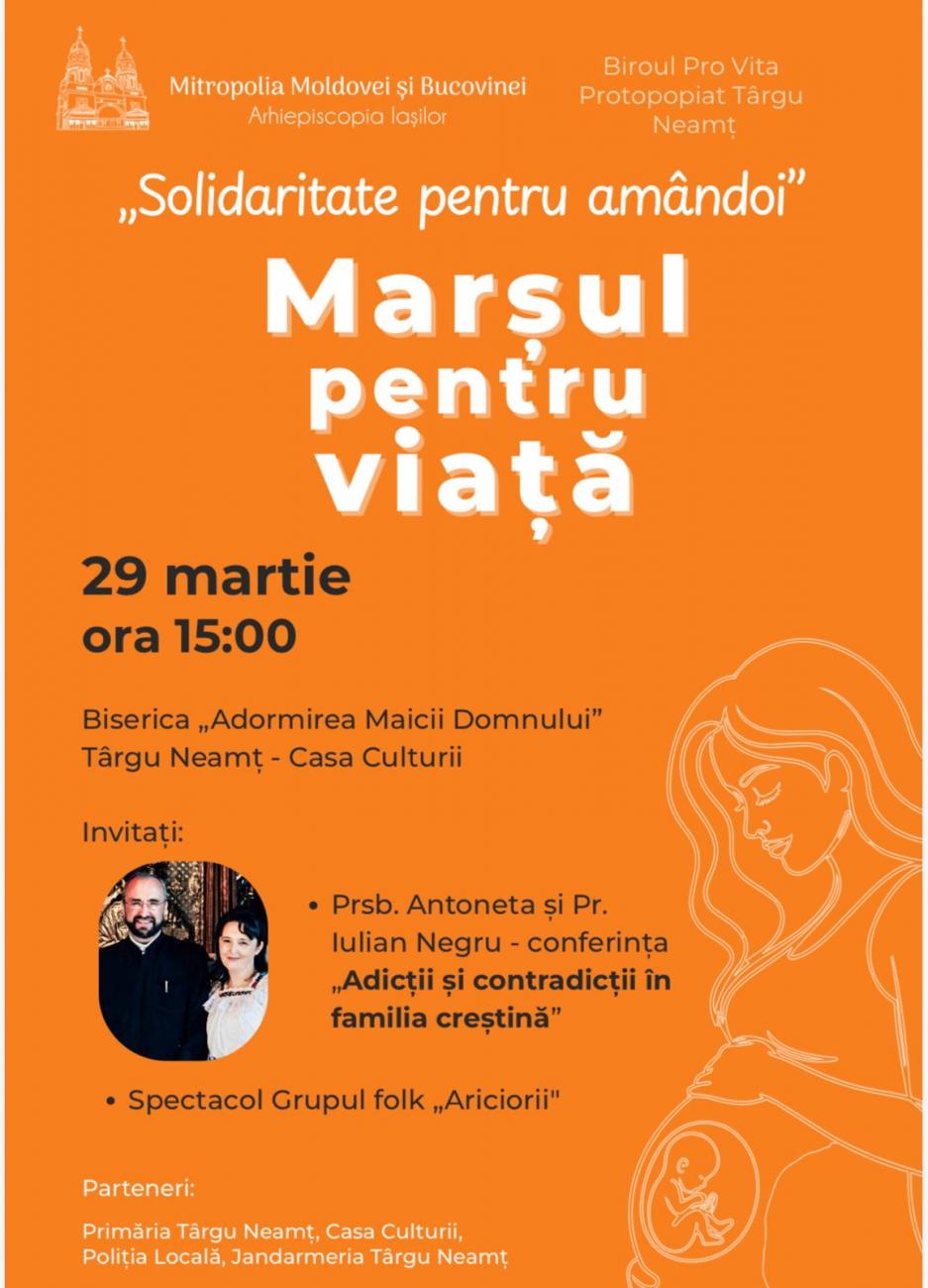 Protopopiatul Botoșani, împreună cu Departamentul Pro Vita al Protopopiatului Botoșani, organizează, începând cu ora 14.00, Marșul pentru viață, cu tema „Solidaritate pentru amândoi”, care se va desfășura în municipiul Botoșani, pe traseul: Biserica „Buna Vestire” – str. Octav Onicescu – intersecția cu Calea Națională – Calea Națională – str. Cuza Vodă – sens giratoriu Casa Sindicatelor – str. Arhimandrit Marchian – sens giratoriu Bulevardul George Enescu – Bulevardul George Enescu – Spitalul de Obstetrică și Ginecologie Botoșani – Biserica „Sfânta Treime”.