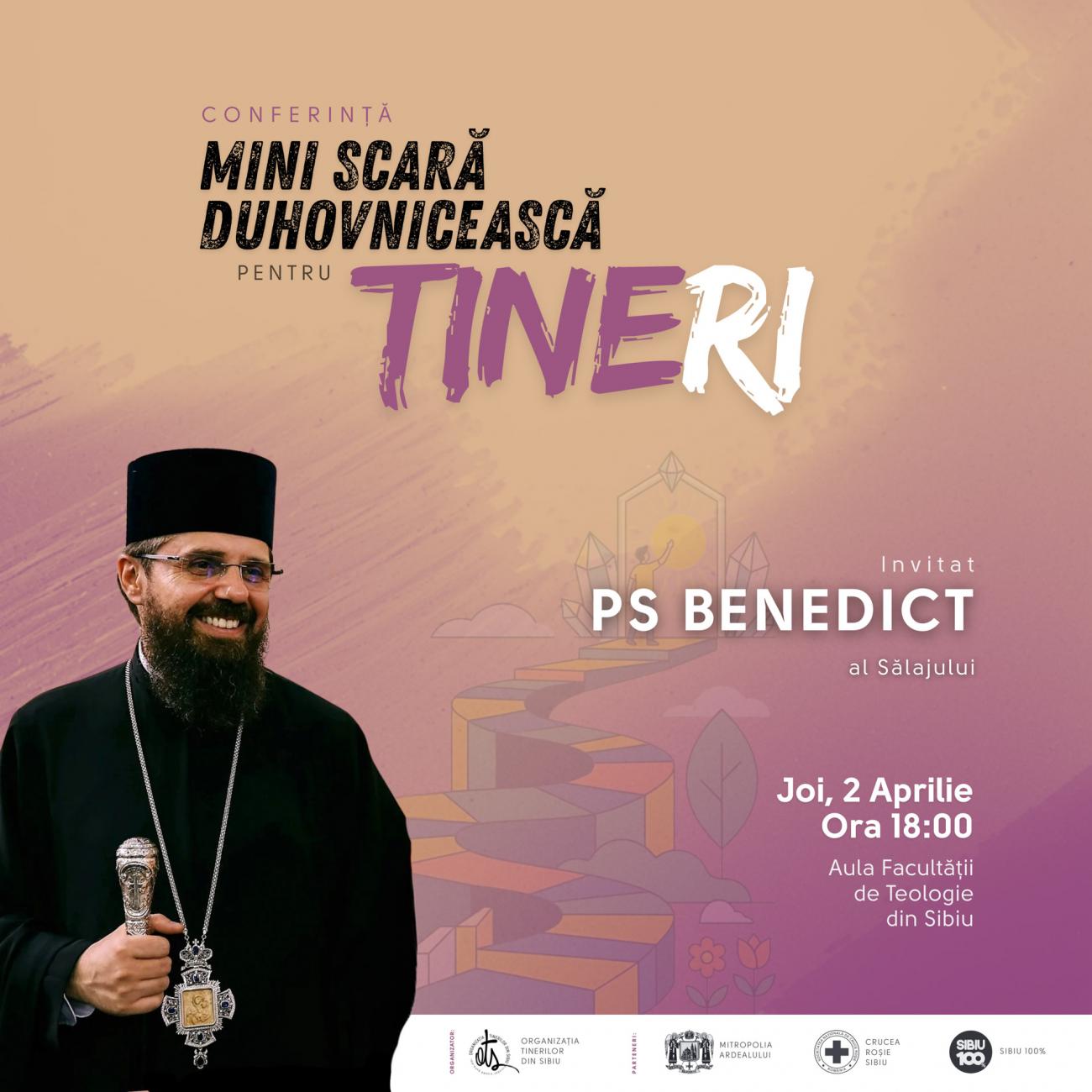 Cu binecuvântarea Înaltpreasfințitului Părinte Laurențiu, Mitropolitul Ardealului, Organizația Tinerilor din Sibiu organizează joi, 2 aprilie 2026, de la ora 18:00, în Aula Facultății de Teologie din Sibiu, conferința „Mini Scara duhovnicească pentru tineri”, avându-l ca invitat pe Preasfințitul Benedict, Episcopul Sălajului.