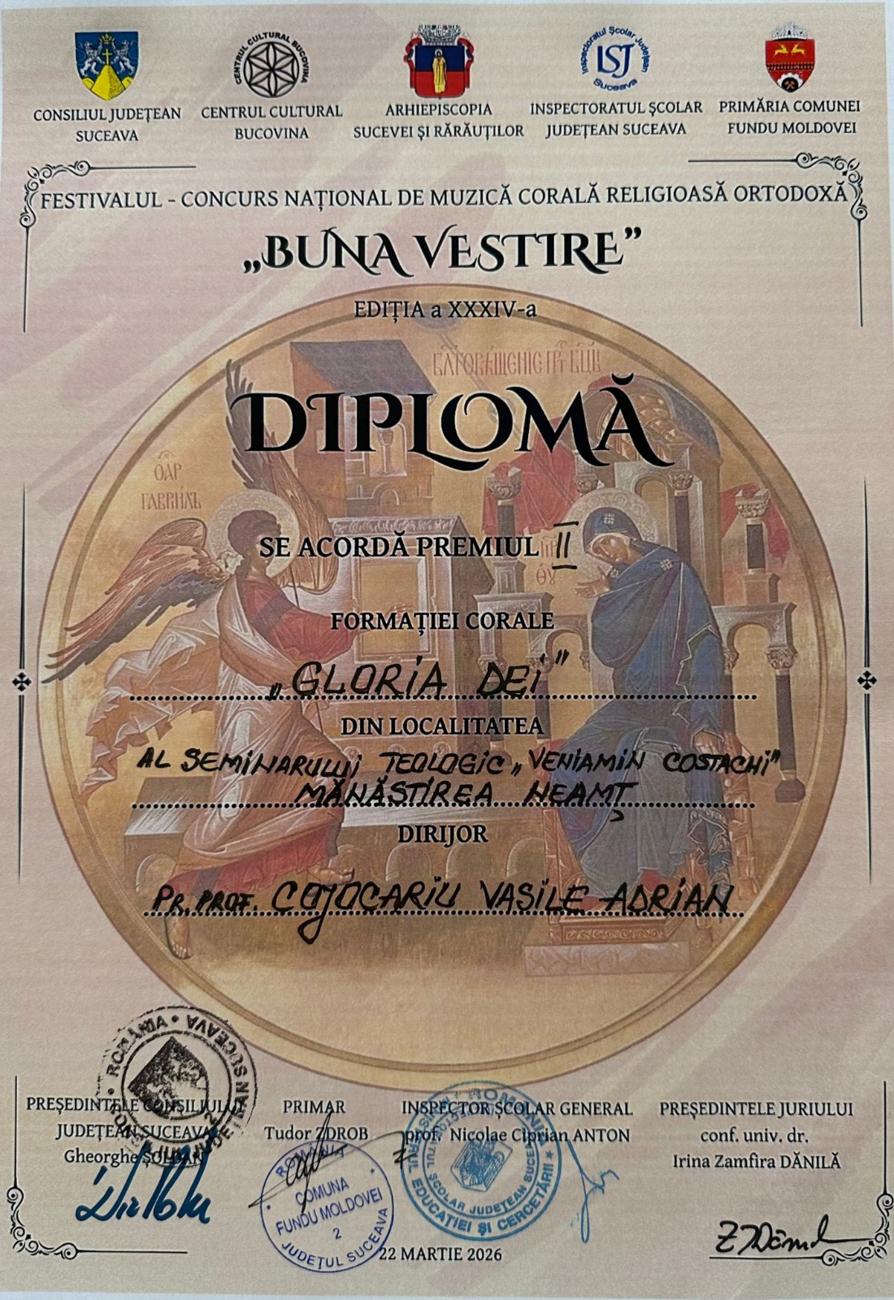 Duminică, 22 martie 2026, localitatea Fundu Moldovei, din județul Suceava, a devenit capitala muzicii corale religioase, găzduind cea de-a XXXIV-a ediție a prestigiosului Festival-Concurs Național de Muzică Corală Religioasă Ortodoxă „Buna Vestire”. Într-o competiție marcată de o încărcătură emoțională aparte, Seminarul Teologic Ortodox „Veniamin Costachi” de la Mănăstirea Neamț a strălucit prin prestațiile celor două formații corale reprezentative: „Victor Ojog” și „Gloria Dei”.
