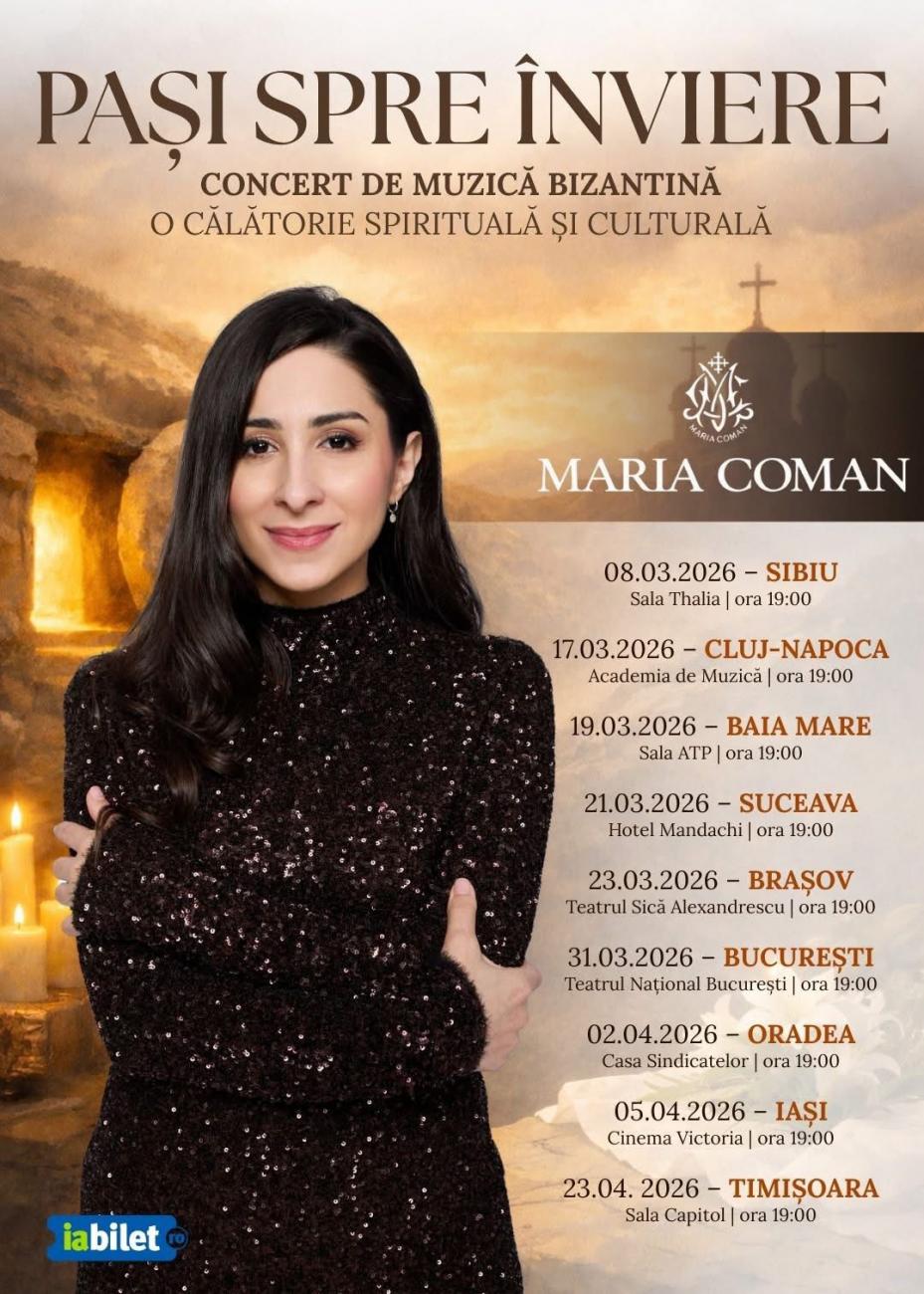 În perioada Postului Mare, artista Maria Coman invită publicul la o serie de concerte de muzică bizantină reunite sub titlul „Pași spre Înviere”, un turneu național conceput ca o călătorie spirituală prin rugăciune, reflecție și frumusețea tradiției sonore a Ortodoxiei.